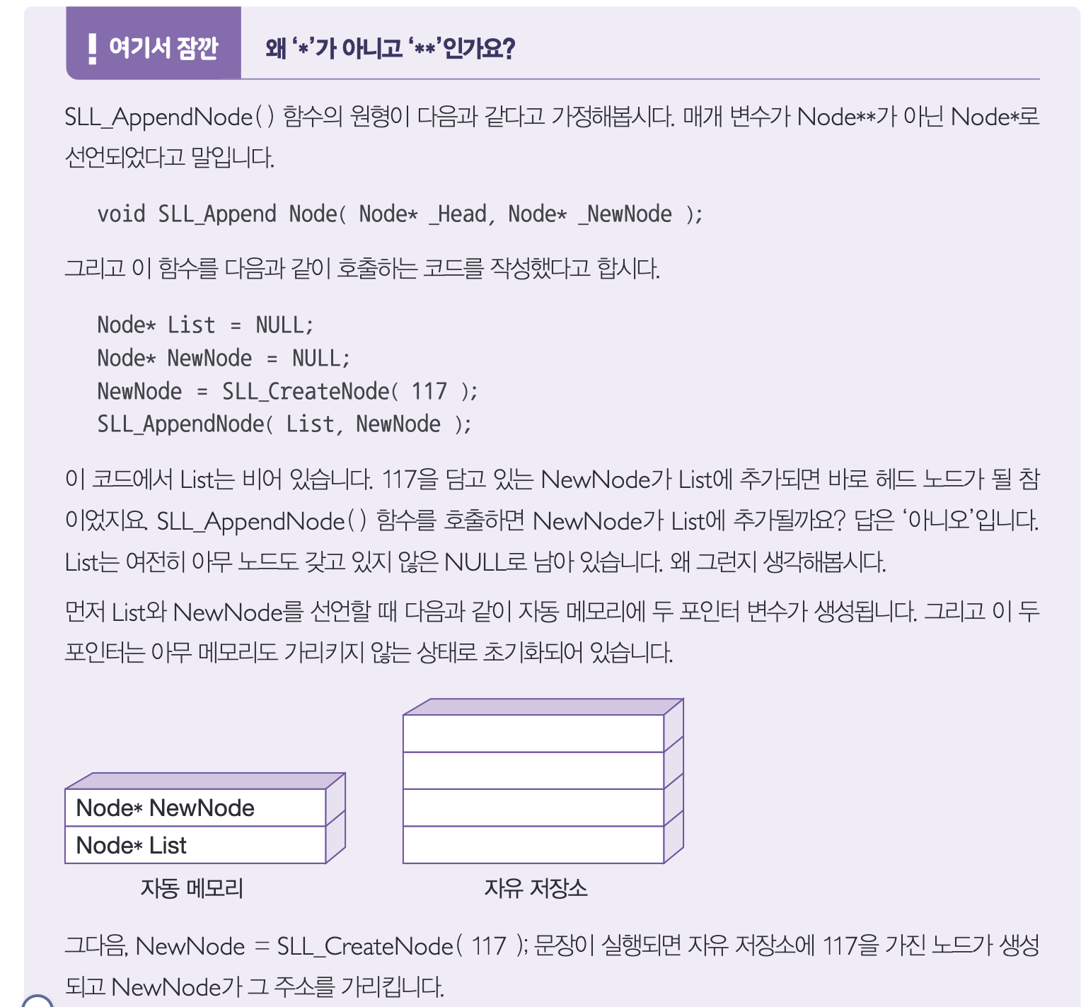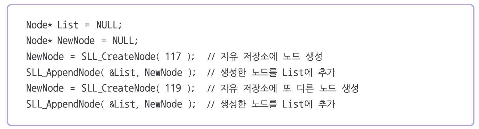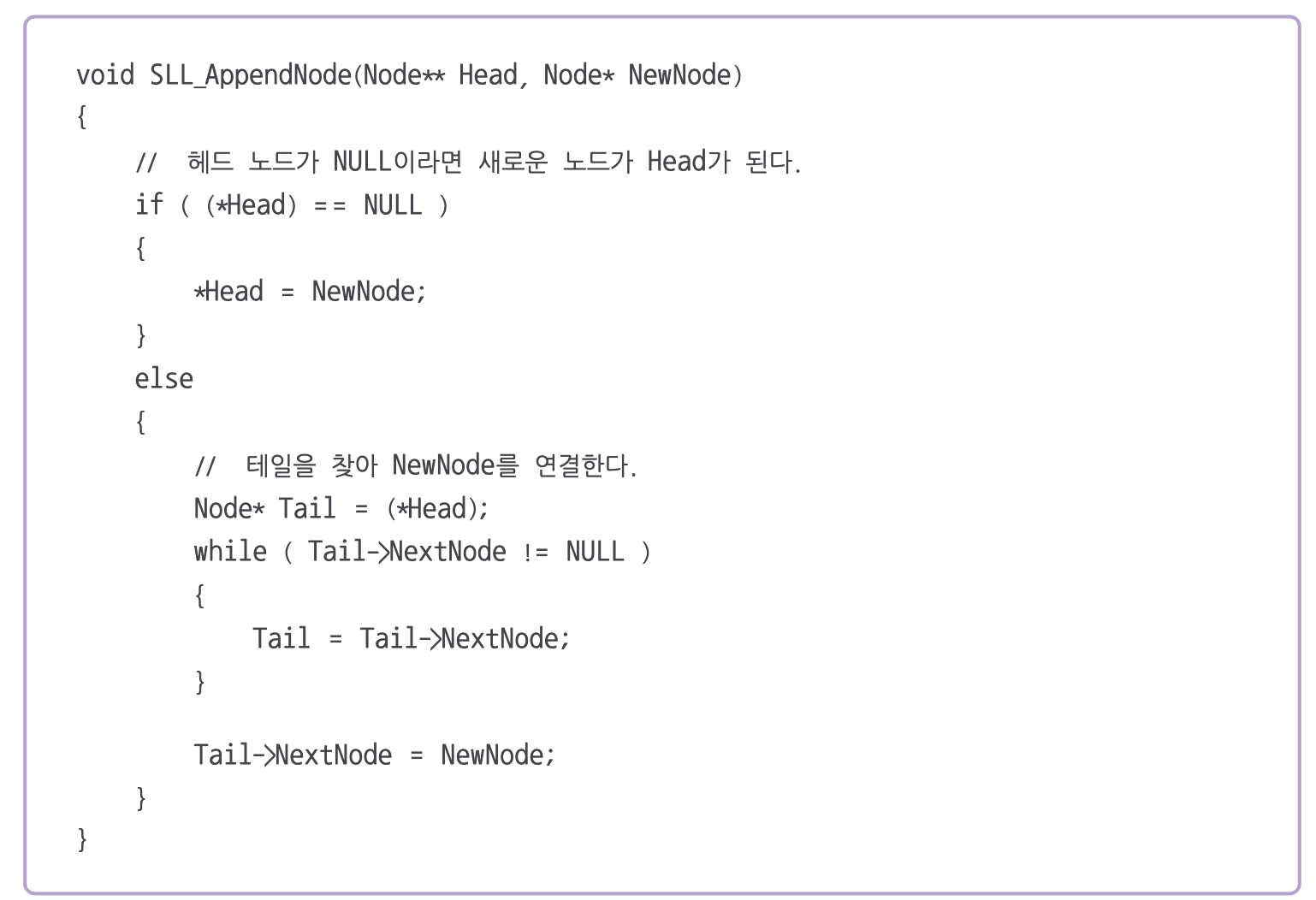 SLL_CreateNode() 함수를 이용하여 자유 저장소에 노드를 생성한 다음, 새로 생성한 노드의 주소를 테일의 NextNode 포인터에 저장하면 된다.