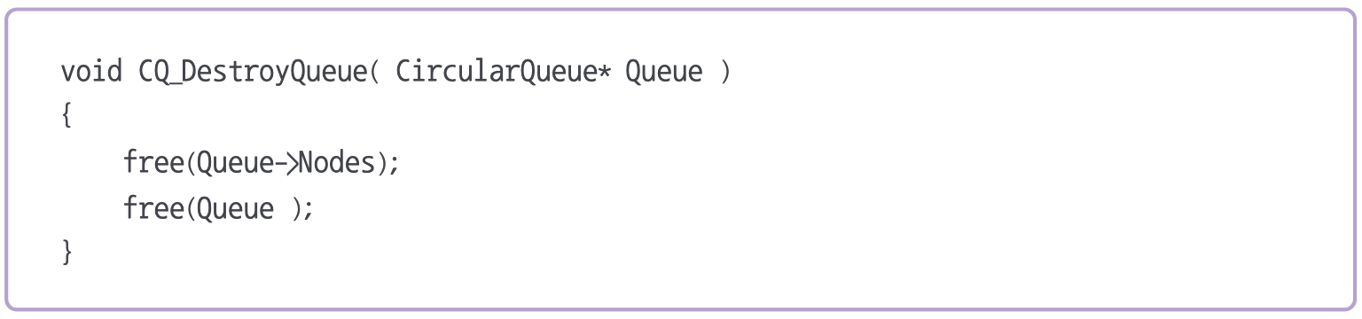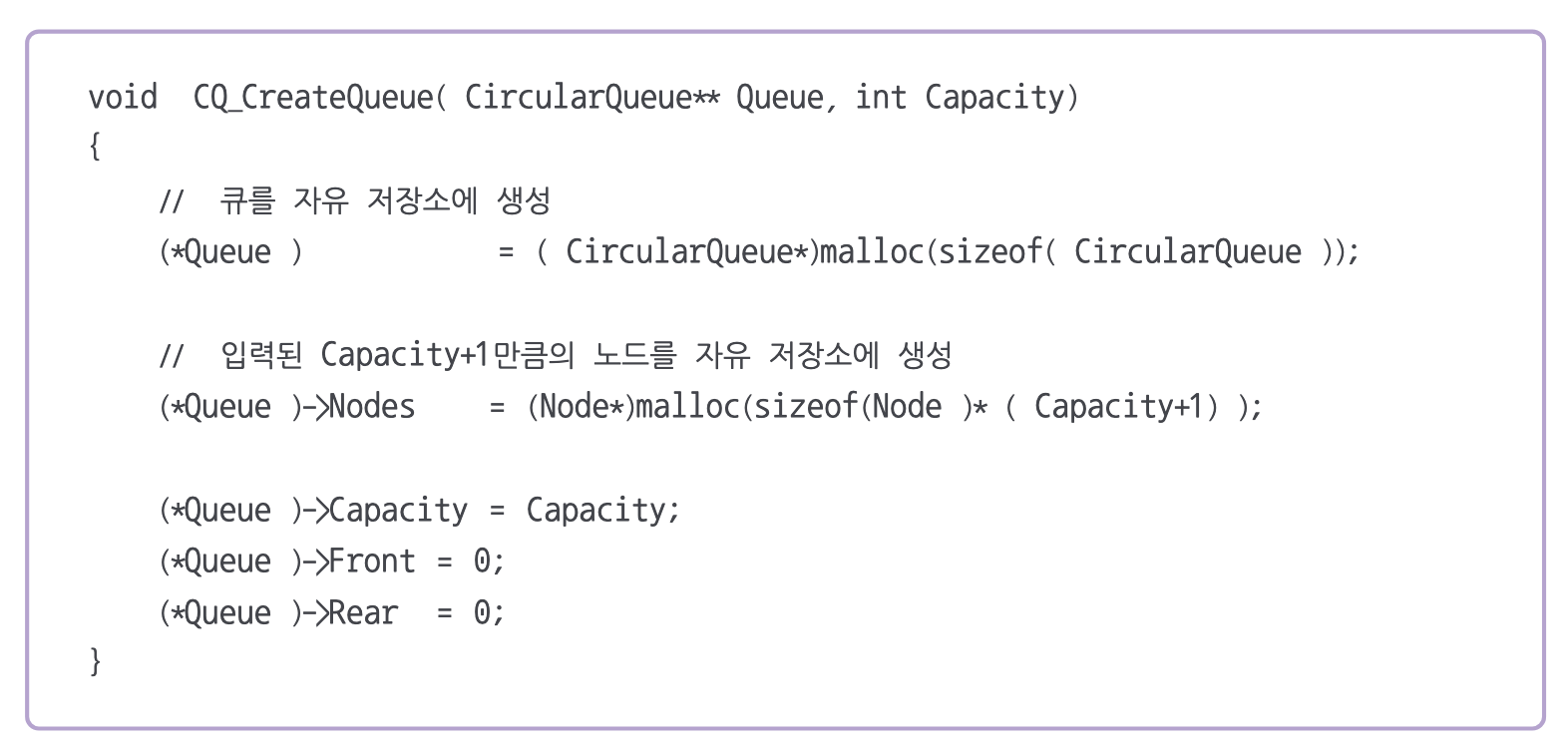 순환큐를 나타내는 CircularQueue 구조체는 Queue의 용량(capacity) 전단의 위치(Front) , 후단의 위치(Rear) 순환 큐 요소의 배열에 대한 포인터를 갖고 있다.