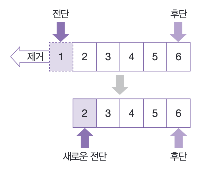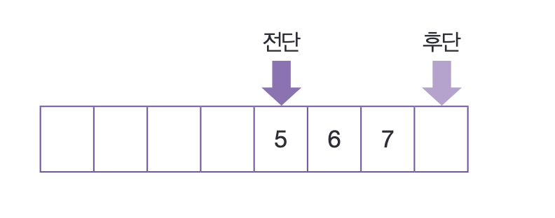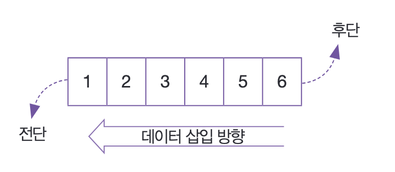 큐의 가장 앞 요소를 전단이라고 하고, 가장 마지막 요소를 후단이라고 부릅니다.