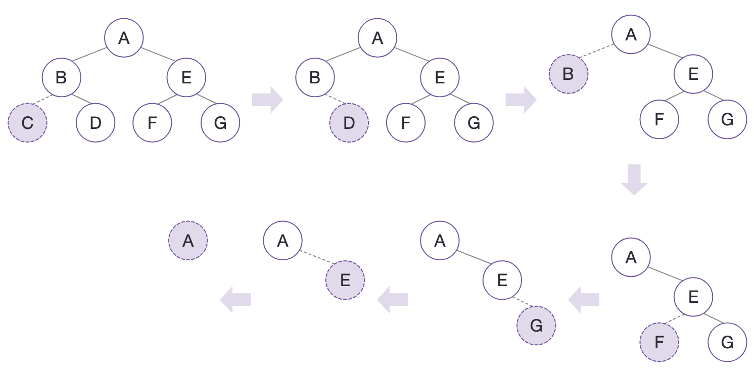 이 잎 노드에서 부터 시작된 순회는 부모 노드를 방문한 후 자신의 형제 노드를 방문하는 것으로 이어진다.