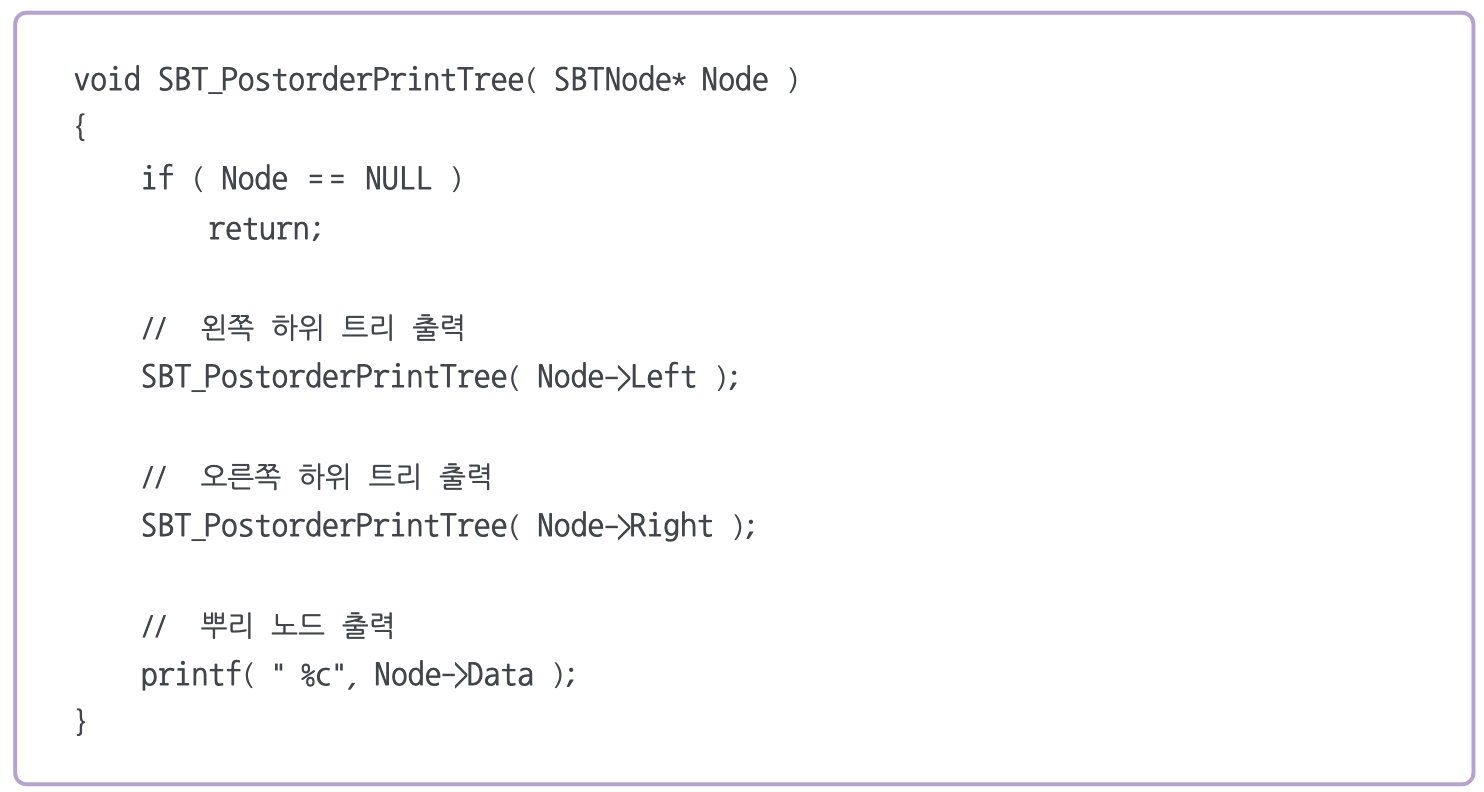 // 따라서 잎 노드부터 방문하여 뿌리 노드까지 거슬러 올라가며 방문하는 후위순회를 이용하면