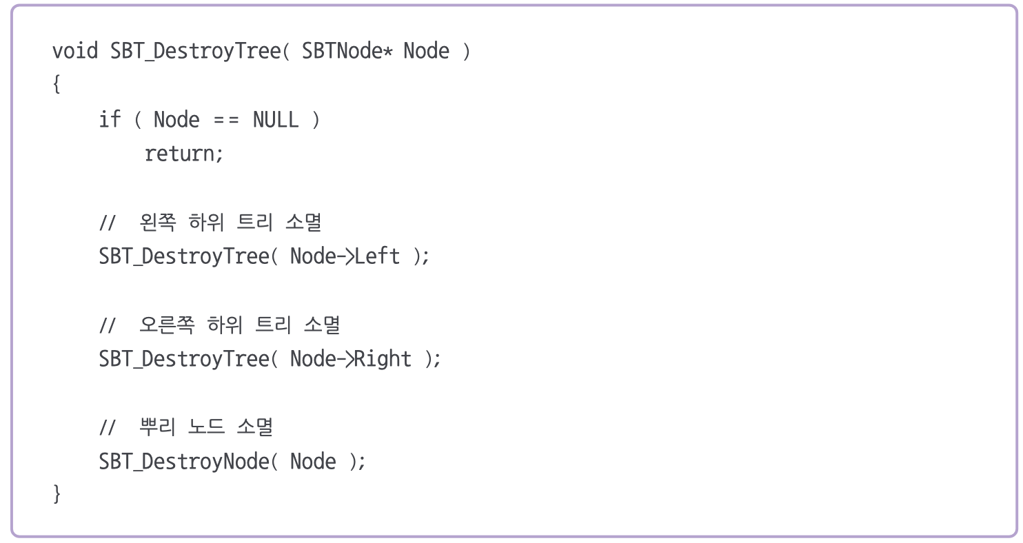 트리를 구축할 때는 노드들이 어떤 순서로 생성되든 별로 문제되지 않지만, 트리를 파괴할 때는 반드시 잎 노드부터 자유 저장소에서 제거해야 한다.