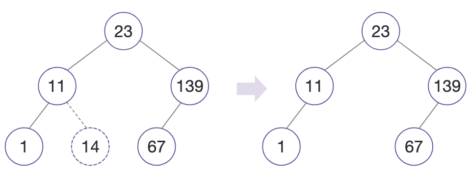 마침 11의 오른쪽 자식 트리가 없으니 여기에 새 노드 14를 연결하면 된다.