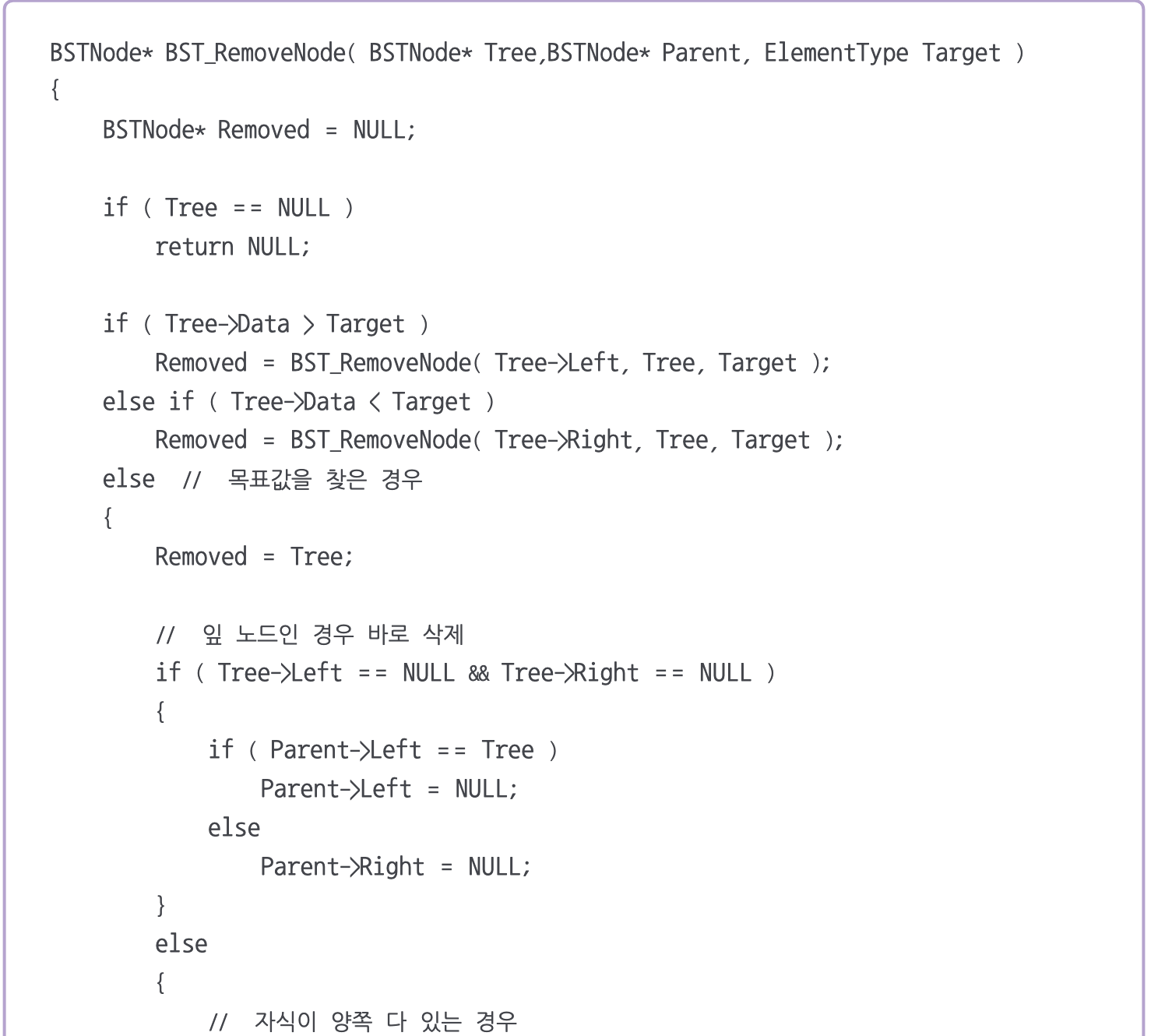 이때 떼어내는 노드가 '잎 노드'라면 아무 걱정 없이 부모 노드에서 자식 노드의 포인터를 NULL로 봉합하고 삭제한 노드의 주소를 반환하면 작업이 깔끔하게 마무리 된다.